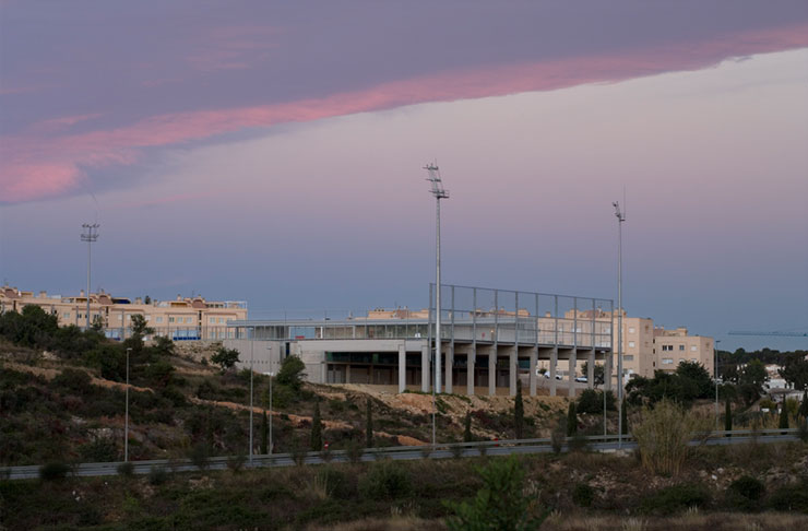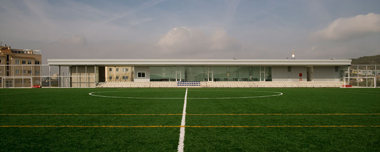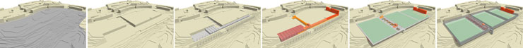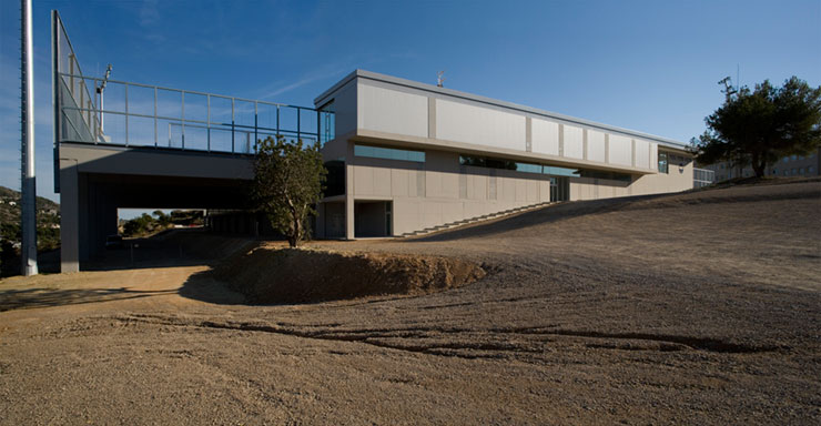 Una de las claves del proyecto es la resolución del conflicto entre las grandes superficies planas que requieren los campos y la topografía inclinada del terreno. Para ello, se proyecta un nuevo espacio urbano cubierto de grandes dimensiones —7 metros de altura, 22 de ancho y 245 de largo— que se convierte en una infraestructura polivalente abierta a múltiples usos, entre ellos el aparcamiento.